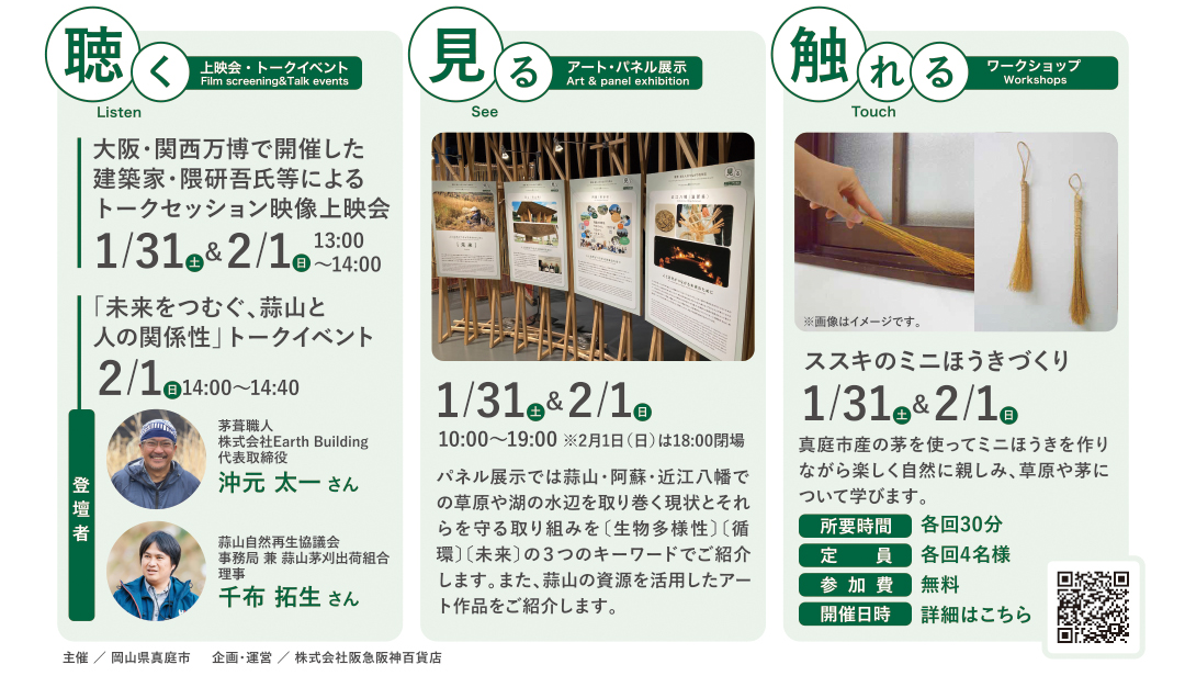 本イベントでは、EARTH MARTに茅を提供した蒜山(岡山)・阿蘇(熊本)・近江八幡(滋賀)の3つの地域から、それぞれ異なる「茅」の魅力や環境保全の取り組みを「聴く」「見る」「触れる」の3つのアプローチでご紹介します。